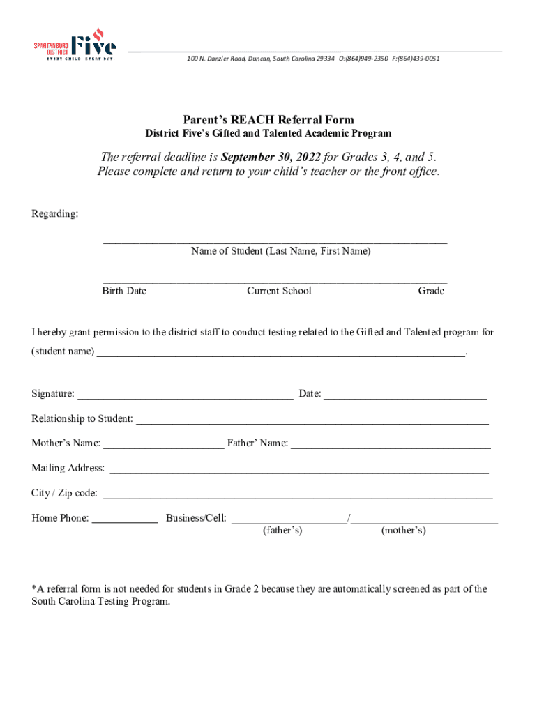 100 N. Dazzler Road, Duncan, South Carolina 29334 O:(864)9492350 F:(864)4390051Parents REACH Referral Redistrict Fives Gifted and Talented Academic Program referral deadline is September 30, 2022,