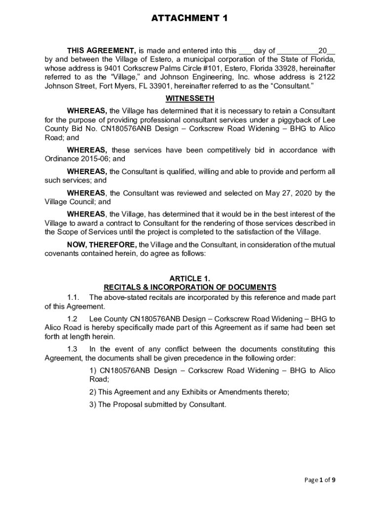 ATTACHMENT 1 THIS AGREEMENT, is made and entered into this ___ day of ___20__ by and between the Village of Ester, a municipal corporation of the State of Florida, whose address is 9401 Corkscrew