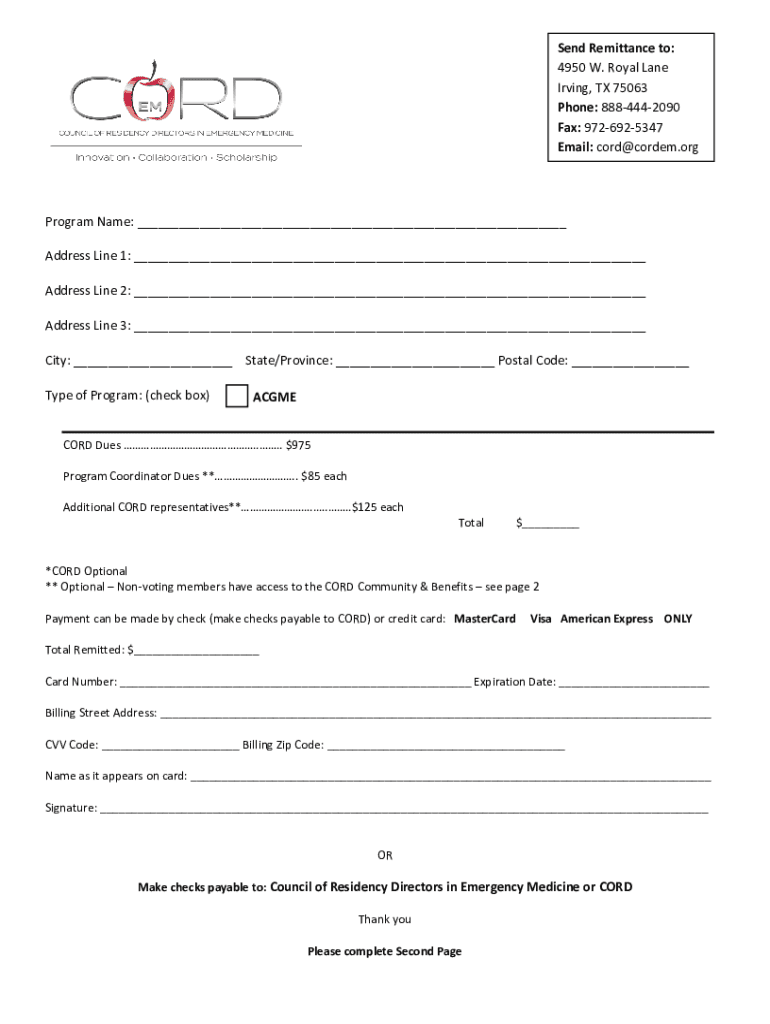 Send Remittance to: 4950 W. Royal Lane Irving, TX 75063 Phone: 8884442090 Fax: 9726925347 Email: cord@cordem.orgProgram Name: ___ Address Line 1: ___ Address Line 2: ___ Address Line 3: ___ City: