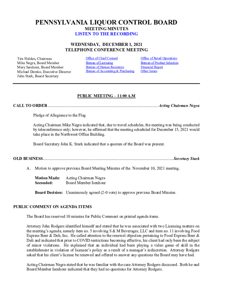 PENNSYLVANIA LIQUOR CONTROL BOARD MEETING MINUTES LISTEN TO THE RECORDINGWEDNESDAY, DECEMBER 1, 2021, TELEPHONE CONFERENCE MEETING Tim Holden, Chairman Mike Afro-American, Board Member Mary Senior,