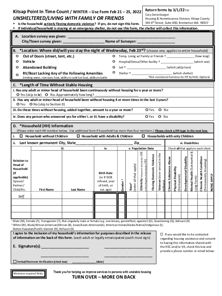 Kit sap Point In Time Count / WINTER Use Form Feb 21 25, 2022UNSHELTERED/LIVING WITH FAMILY OR FRIENDSReturn forms by 3/1/22 to:Cory Hamburger Housing & Homelessness Division, Kitsap County 345 6th