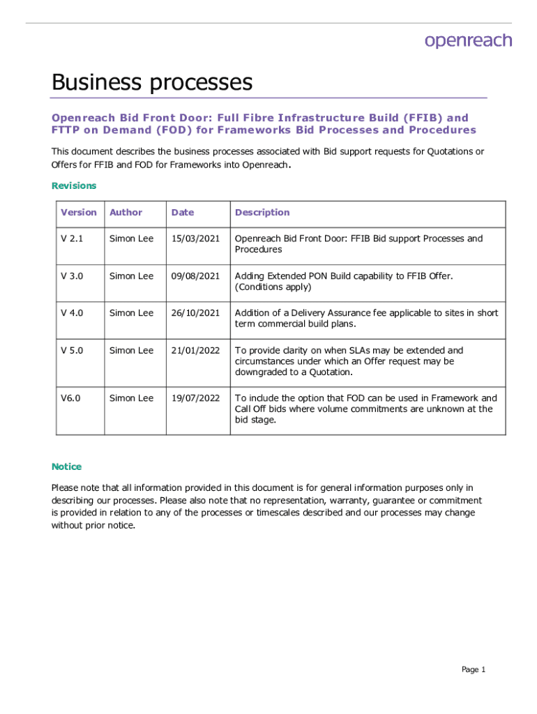 Business processes Open reach Bid Front Door: Full Fiber Infrastructure Build (FIB) and FTP on Demand (FOD) for Frameworks Bid Processes and Procedures This document describes the business processes