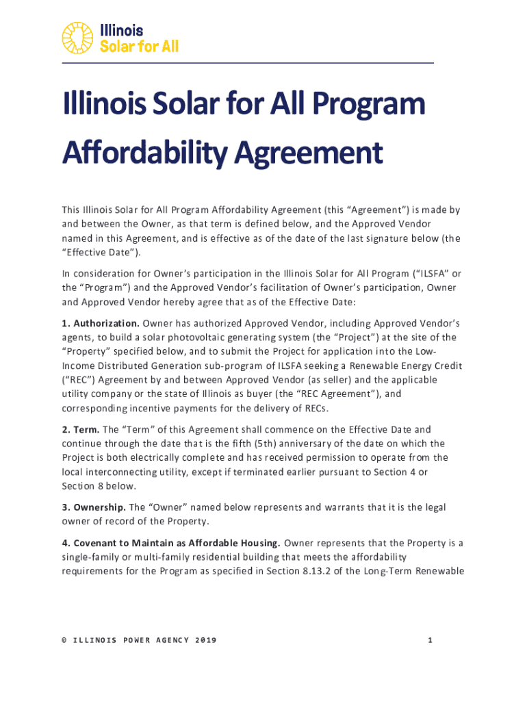 Illinois Solar for All Program Affordability Agreement This Illinois Solar for All Program Affordability Agreement (this Agreement) is made by and between the Owner, as that term is defined below,