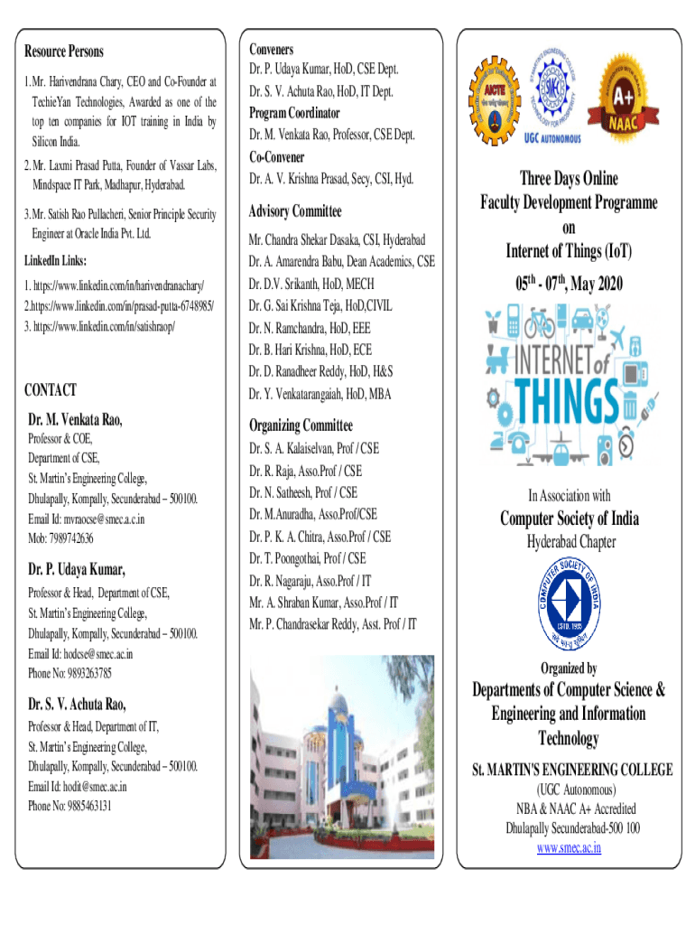 Resource Persons 1. Mr. Harivendrana Chary, CEO and CoFounder at Technician Technologies, Awarded as one of the top ten companies for IOT training in India by Silicon India. 2. Mr. Lax me Prasad Putt,