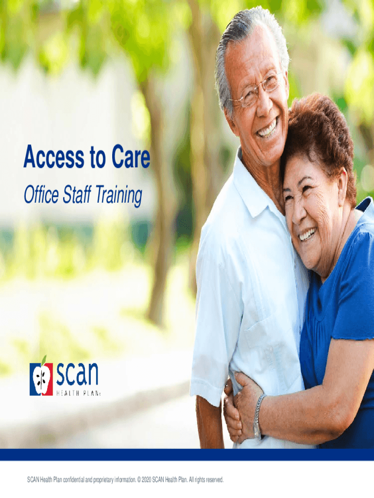 Access to Care Office Staff Trainings Health Plan confidential and proprietary information. 2020 SCAN Health Plan. All rights reserved. Access to Care Objectives Explain access to care and potential