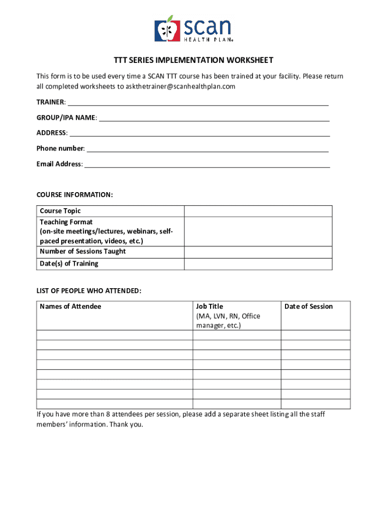 TTT SERIES IMPLEMENTATION WORKSHEET This form is to be used every time a SCAN TTT course has been trained at your facility. Please return all completed worksheets to askthetrainer@scanhealthplan.com