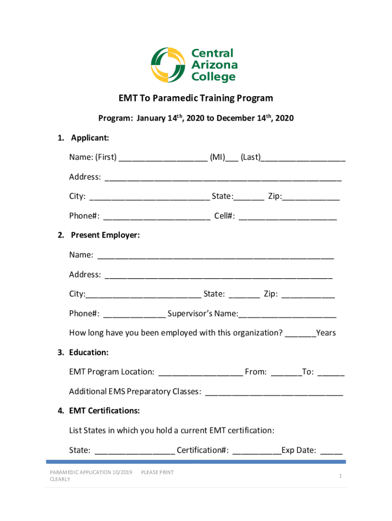 EMT To Paramedic Training Program: January 14th, 2020 to December 14th, 2020 1. Applicant: Name: (First) ___ (MI)___ (Last)___ Address: ___ City: ___ State:___ Zip:___ Phone#: ___ Cell#: ___ 2. Present