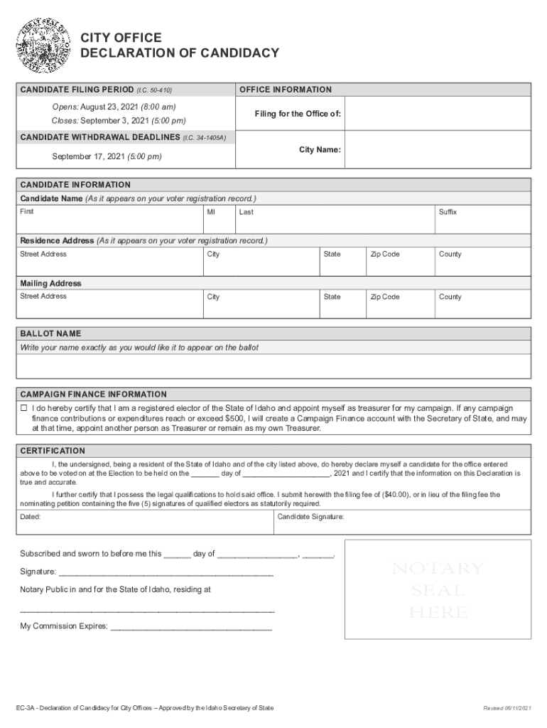 CITY OFFICE CANDIDATE FILING INFORMATION This information is subject to amendatory change during the 2021 session of the Idaho Legislature. If changes occur, an updated version will be made available.