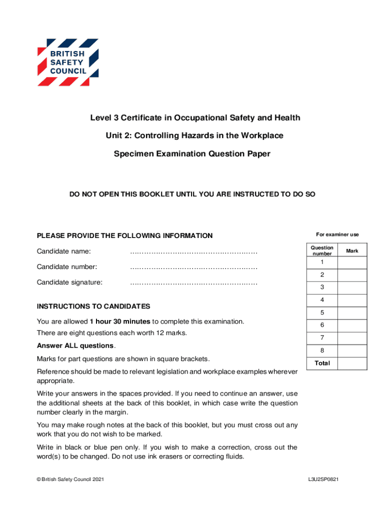 Level 3 Certificate in Occupational Safety and Health Unit 2: Controlling Hazards in the Workplace Specimen Examination Question Paper DO NOT OPEN THIS BOOKLET UNTIL YOU ARE INSTRUCTED TO DO PLEASE