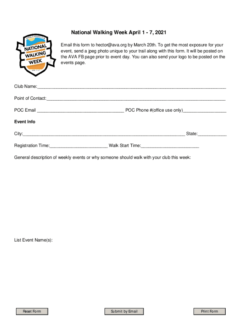 National Walking Week April 1 7, 2021 Email this form to hector@ava.org by March 20th. To get the most exposure for your event, send a JPEG photo unique to your trail along with this form. It will