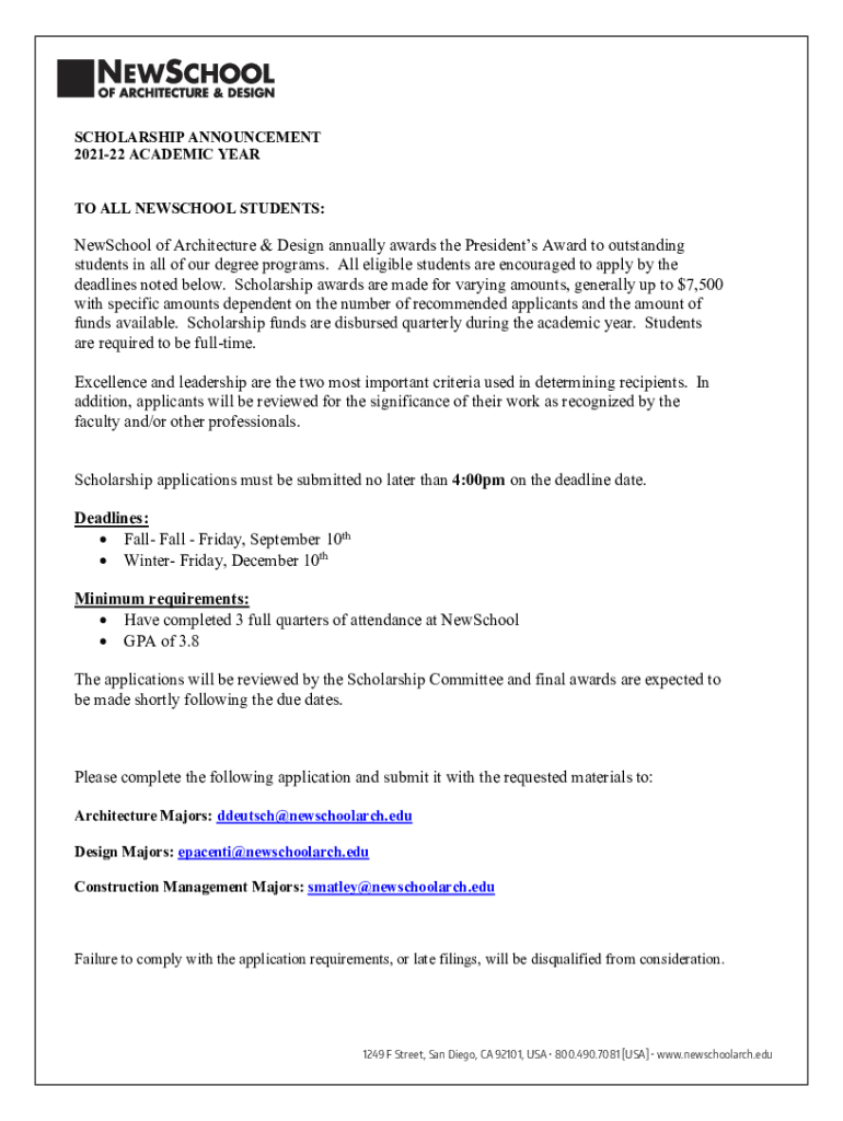 SCHOLARSHIP ANNOUNCEMENT 202122 ACADEMIC YEAR TO ALL SCHOOL STUDENTS:School of Architecture & Design annually awards the Presidents Award to outstanding students in all of our degree programs. All
