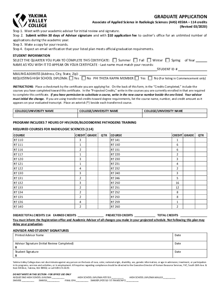 GRADUATE APPLICATION Associate of Applied Science in Radiologic Sciences (AAS) #358A 114 credits (Revised 03/2020) Step 1. Meet with your academic advisor for initial review and signature. Step 2.