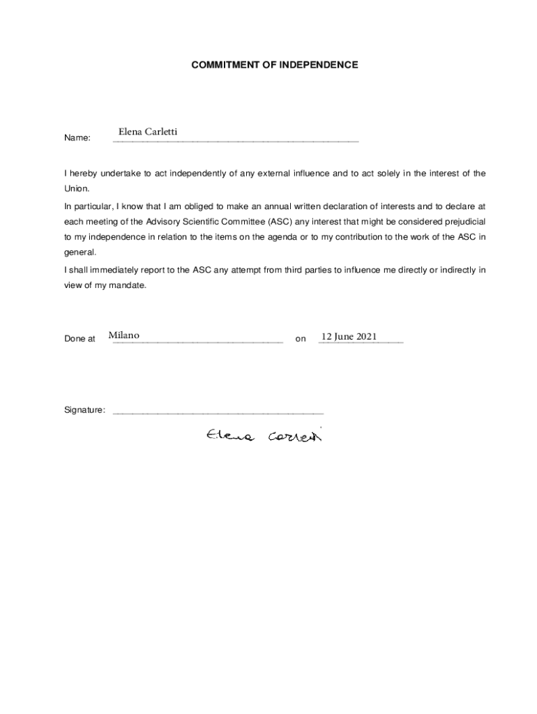 COMMITMENT OF INDEPENDENCEName:Elena Carletti___I hereby undertake to act independently of any external influence and to act solely in the interest of the Union. In particular, I know that I am obliged