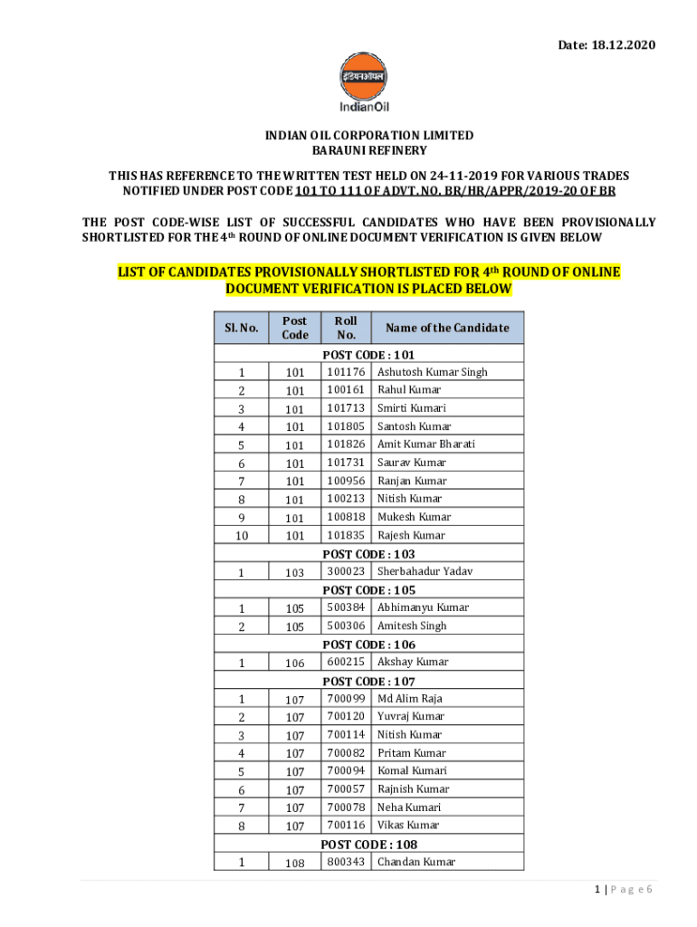 Date: 18.12.2020INDIAN OIL CORPORATION LIMITED BAHRAINI REFINERY THIS HAS REFERENCE TO THE WRITTEN TEST HELD ON 24112019 FOR VARIOUS TRADES NOTIFIED UNDER POST CODE 101 TO 111 OF ADVT. NO. BR/HR/APPR/201920