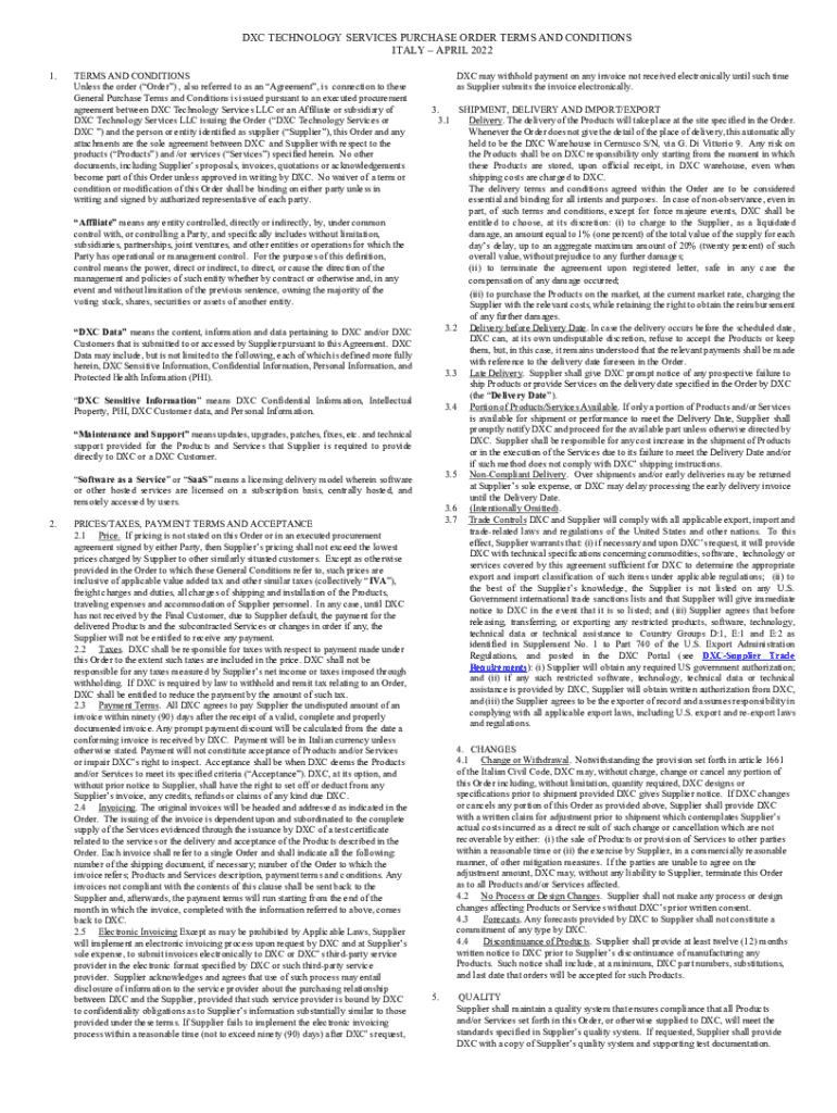 DEC TECHNOLOGY SERVICES PURCHASE ORDER TERMS AND CONDITIONS ITALY APRIL 2022 1.TERMS AND CONDITIONS Unless the order (Order), also referred to as an Agreement, is connection to these General Purchase