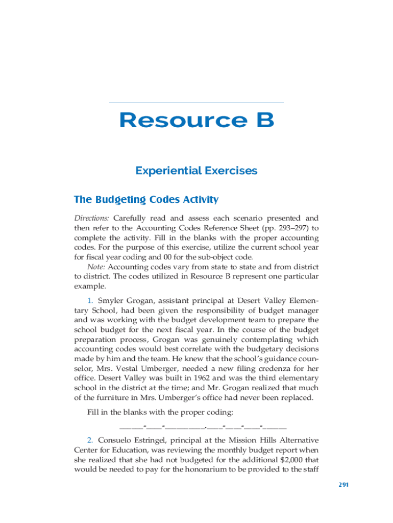 Resource B Experiential Exercises The Budgeting Codes Activity Directions: Carefully read and assess each scenario presented and then refer to the Accounting Codes Reference Sheet (pp. 293297) to