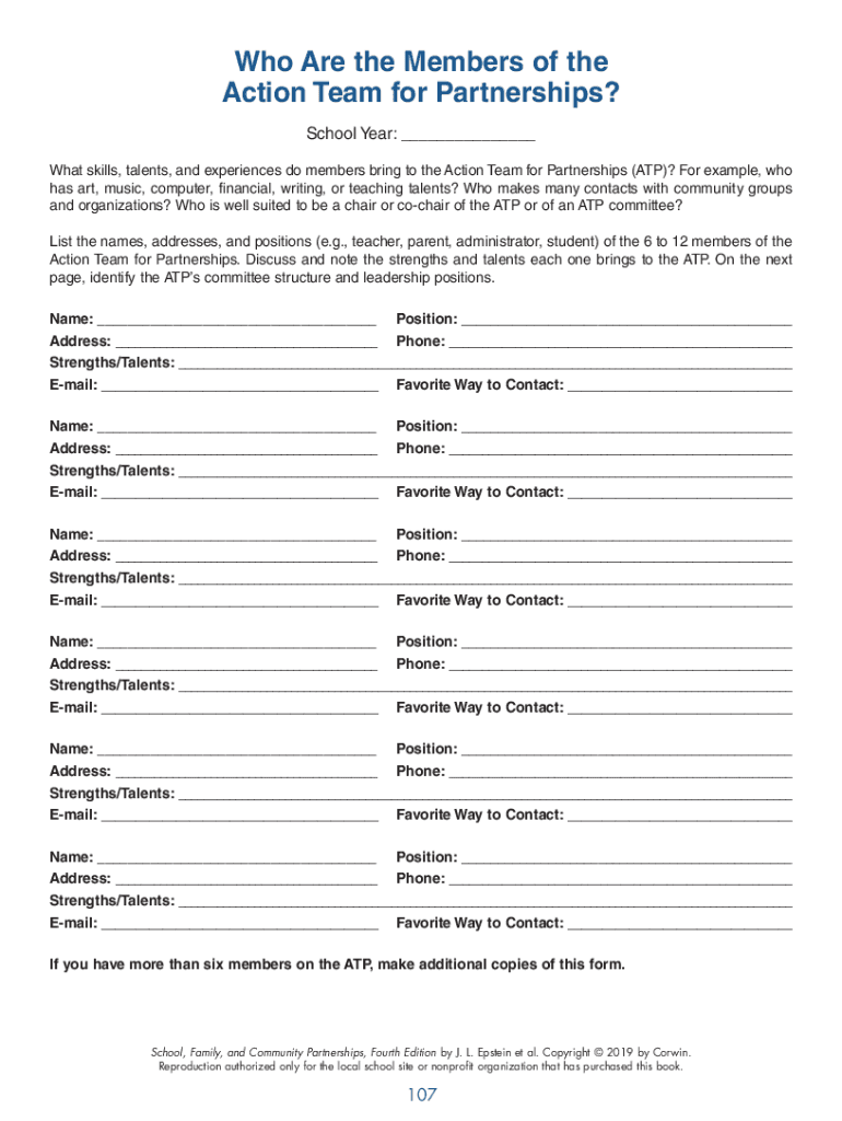 Who Are the Members of the Action Team for Partnerships? School Year: ___ What skills, talents, and experiences do members bring to the Action Team for Partnerships (ATP)? For example, who has art,