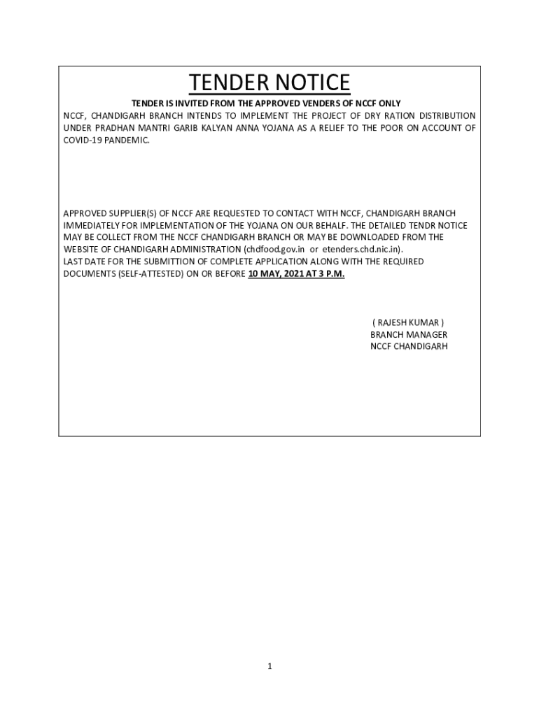 TENDER NOTICETENDER IS INVITED FROM THE APPROVED VENDORS OF CCF ONLY CCF, CHANDIGARH BRANCH INTENDS TO IMPLEMENT THE PROJECT OF DRY RATION DISTRIBUTION UNDER PRADHAN MANTRA GARB KALYAN ANNA JANA AS