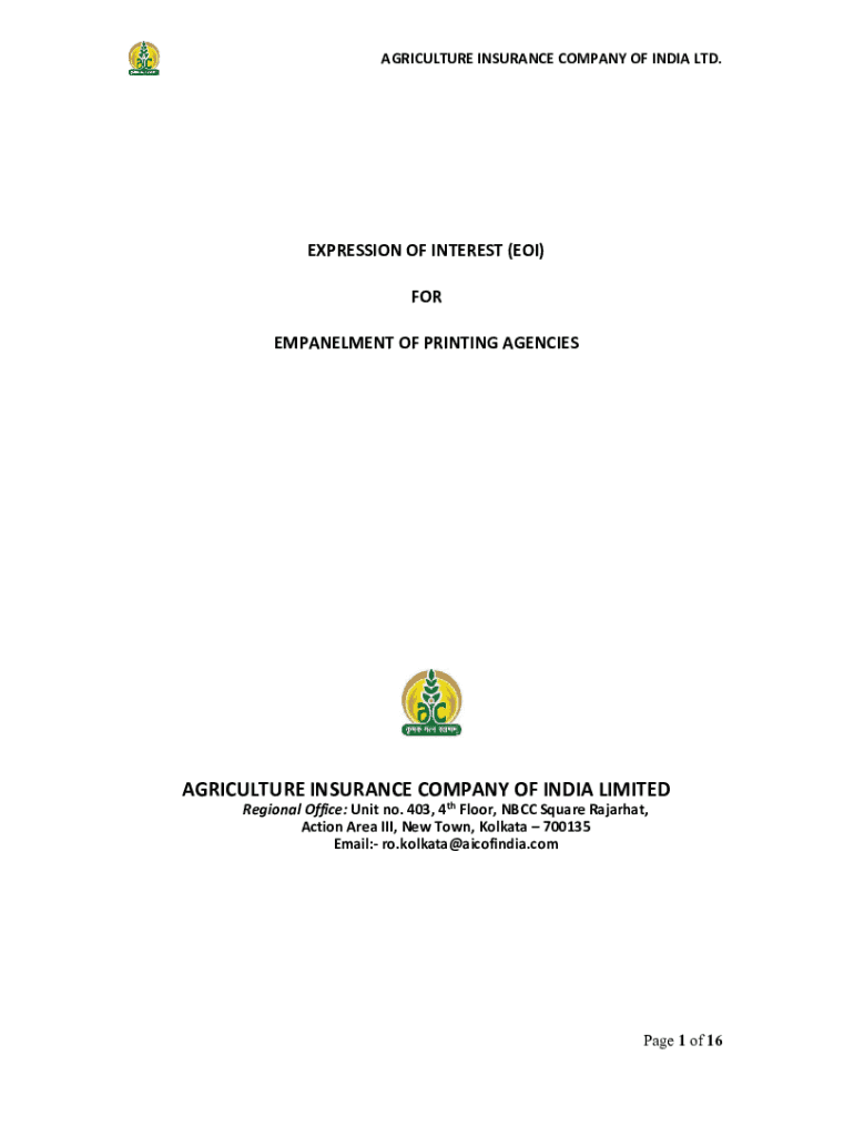AGRICULTURE INSURANCE COMPANY OF INDIA LTD.EXPRESSION OF INTEREST (EOI) FOR EMBANKMENT OF PRINTING AGENCIESAGRICULTURE INSURANCE COMPANY OF INDIA LIMITED Regional Office: Unit no. 403, 4th Floor,