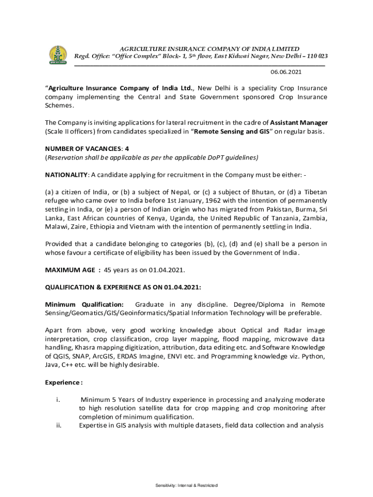 AGRICULTURE INSURANCE COMPANY OF INDIA LIMITED Red. Office: Office Complex Block 1, 5th floor, East Kiddie Nagar, New Delhi 110 023 ___06.06.2021Agriculture Insurance Company of India Ltd., New Delhi