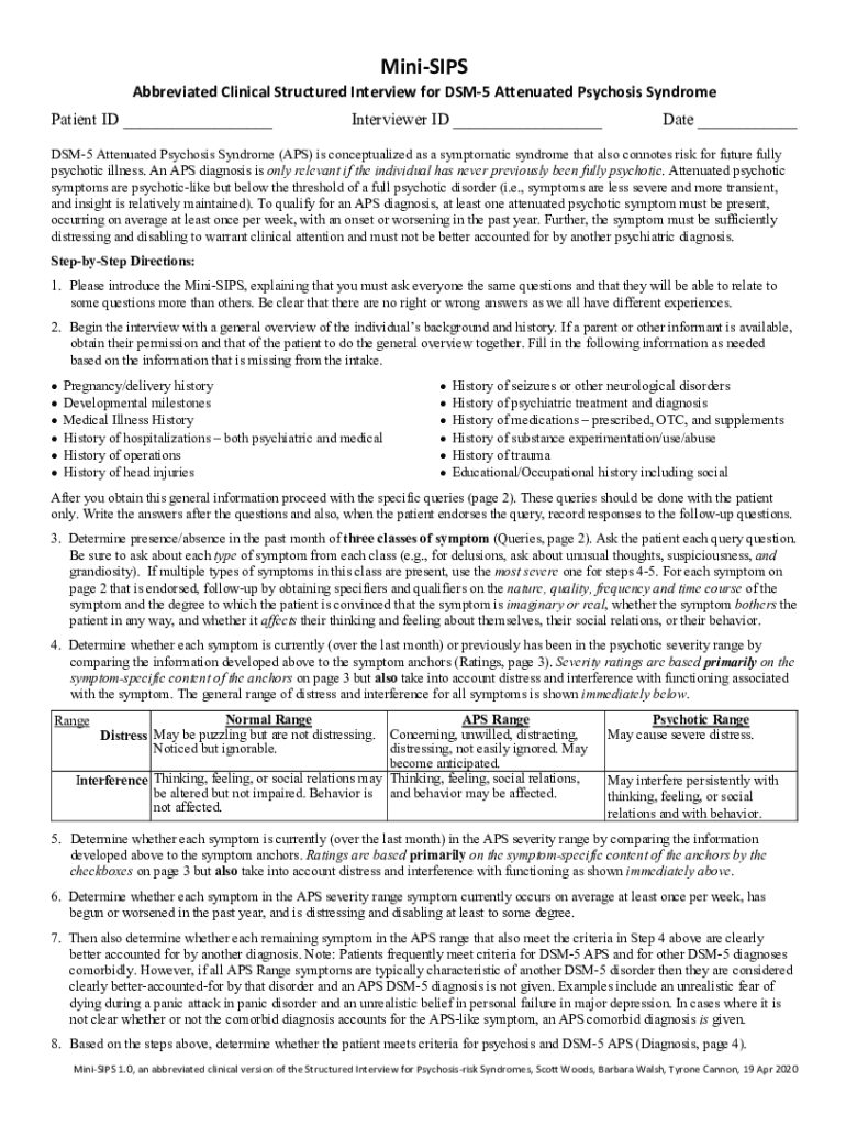 Minis IPS Abbreviated Clinical Structured Interview for DSM5 Attenuated Psychosis Syndrome Patient ID ___Interviewer ID ___Date ___DSM5 Attenuated Psychosis Syndrome (APS) is conceptualized as a symptomatic