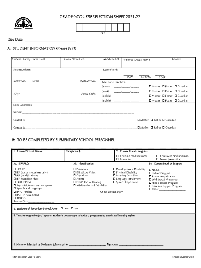 GRADE 9 COURSE SELECTION SHEET 202122OENDue Date: ___ A: STUDENT INFORMATION (Please Print) Students Family Name (Last)Given Name (First)Student AddressMiddle InitialGender:Preferred (Usual) Name:Date