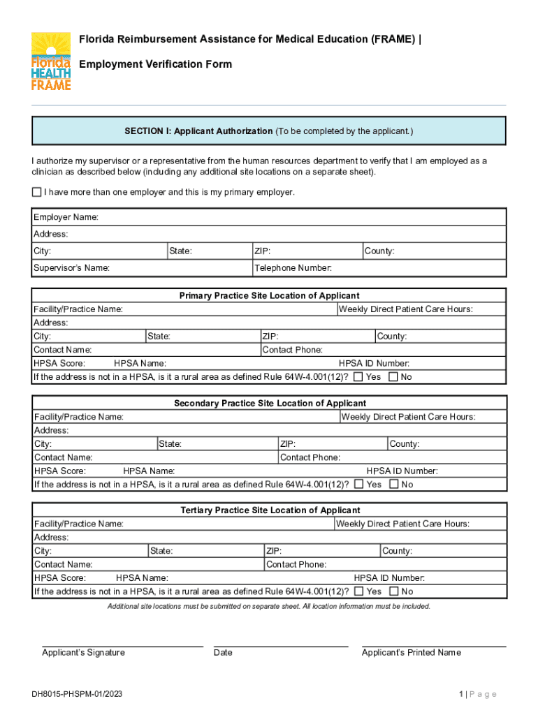 Florida Reimbursement Assistance for Medical Education (FRAME) | Employment Verification Form ___ SECTION I: Applicant Authorization (To be completed by the applicant.) I authorize my supervisor or