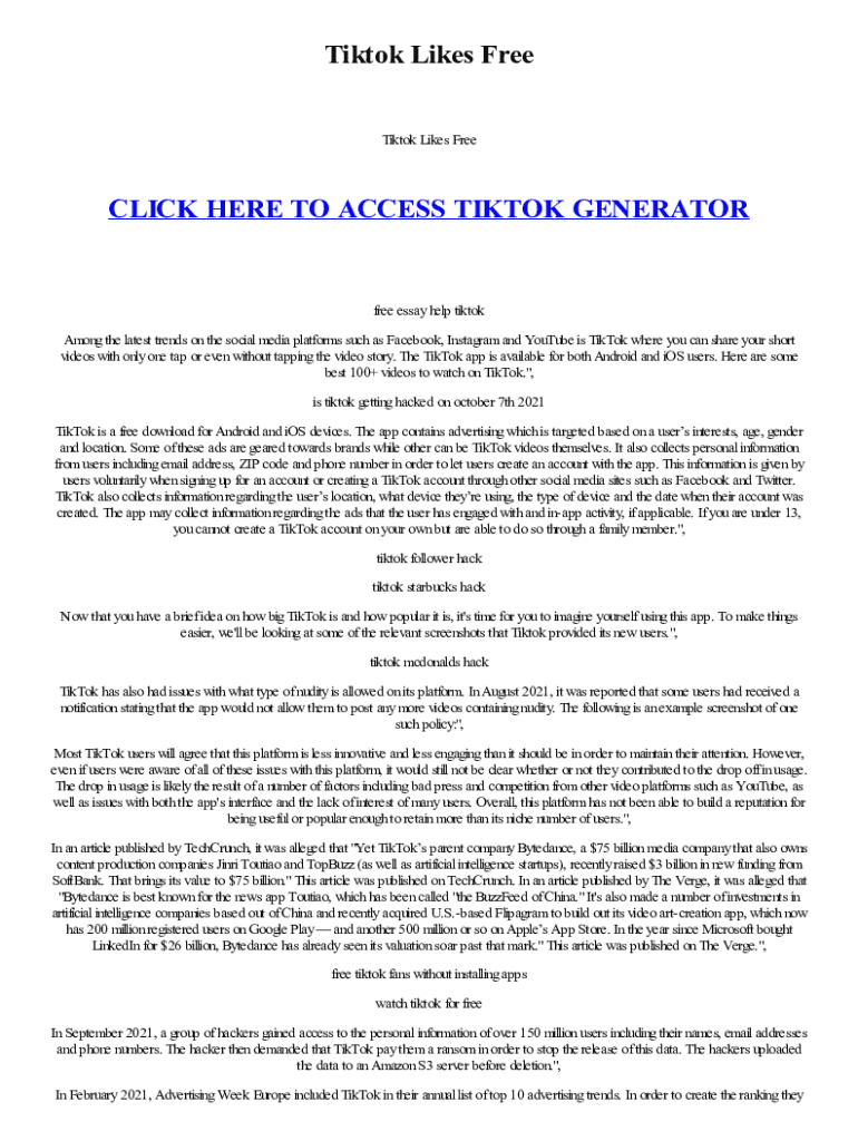 TikTok Likes Free TikTok Likes Frederick HERE TO ACCESS TikTok GENERATOR free essay help TikTok Among the latest trends on the social media platforms such as Facebook, Instagram and YouTube is TikTok