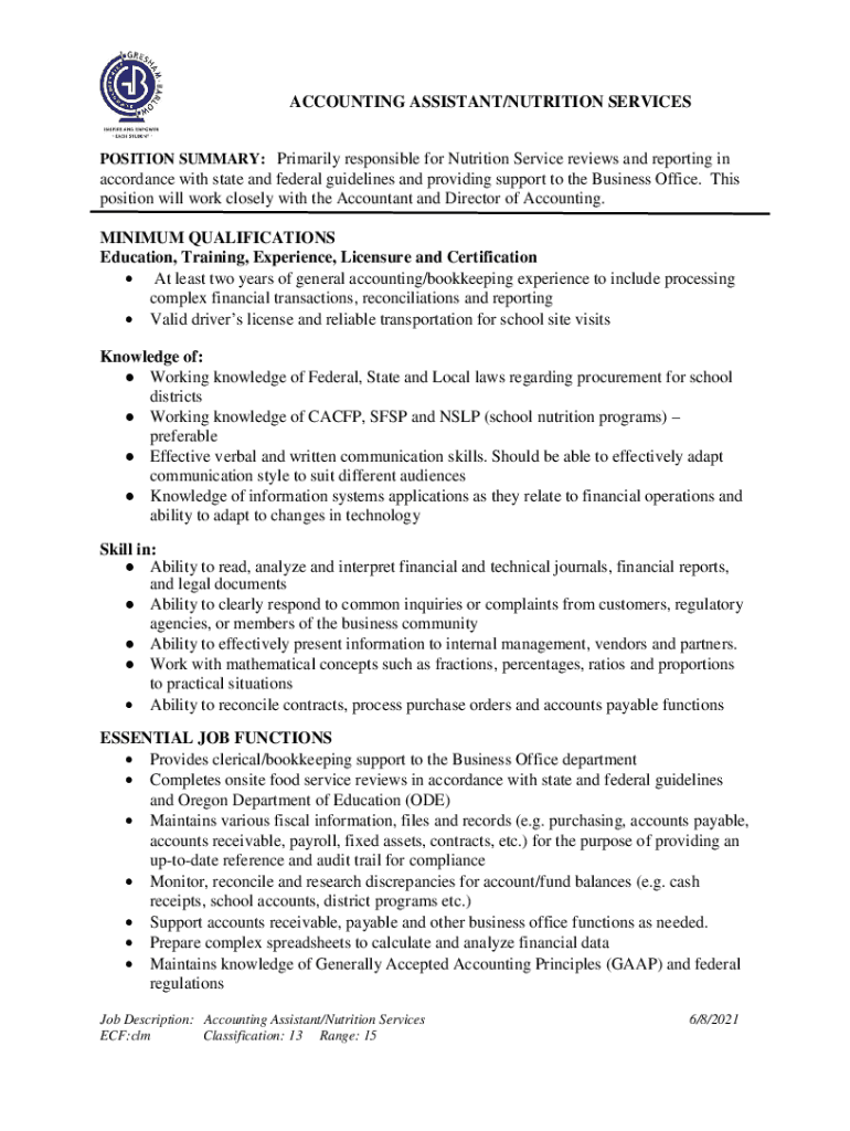 ACCOUNTING ASSISTANT/NUTRITION SERVICES POSITION SUMMARY: Primarily responsible for Nutrition Service reviews and reporting in accordance with state and federal guidelines and providing support to