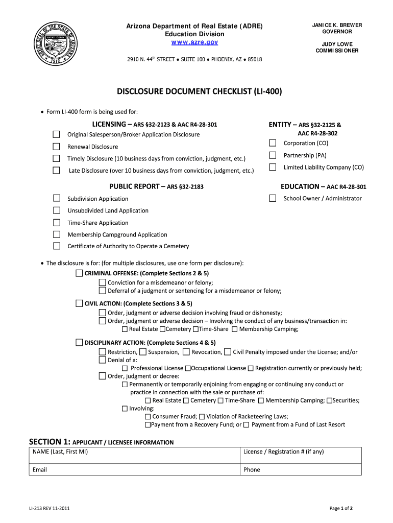 JANICE K. BREWER GOVERNOR Arizona Department of Real Estate (ARE) Education Division www.azre.gov JUDY LOWE COMMISSIONER 2910 N. 44th STREET ? SUITE 100 ? PHOENIX, AZ ? 85018 DISCLOSURE DOCUMENT CHECKLIST