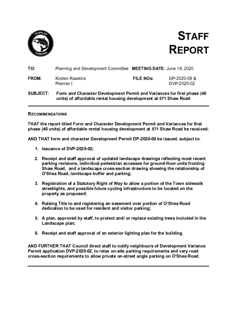 STAFFREPORT TO:Planning and Development Committee MEETING DATE: June 16, 2020FROM:Kirsten Hawkins Planner SUBJECT:Form and Character Development Permit and Variances for first phase (40 units) of