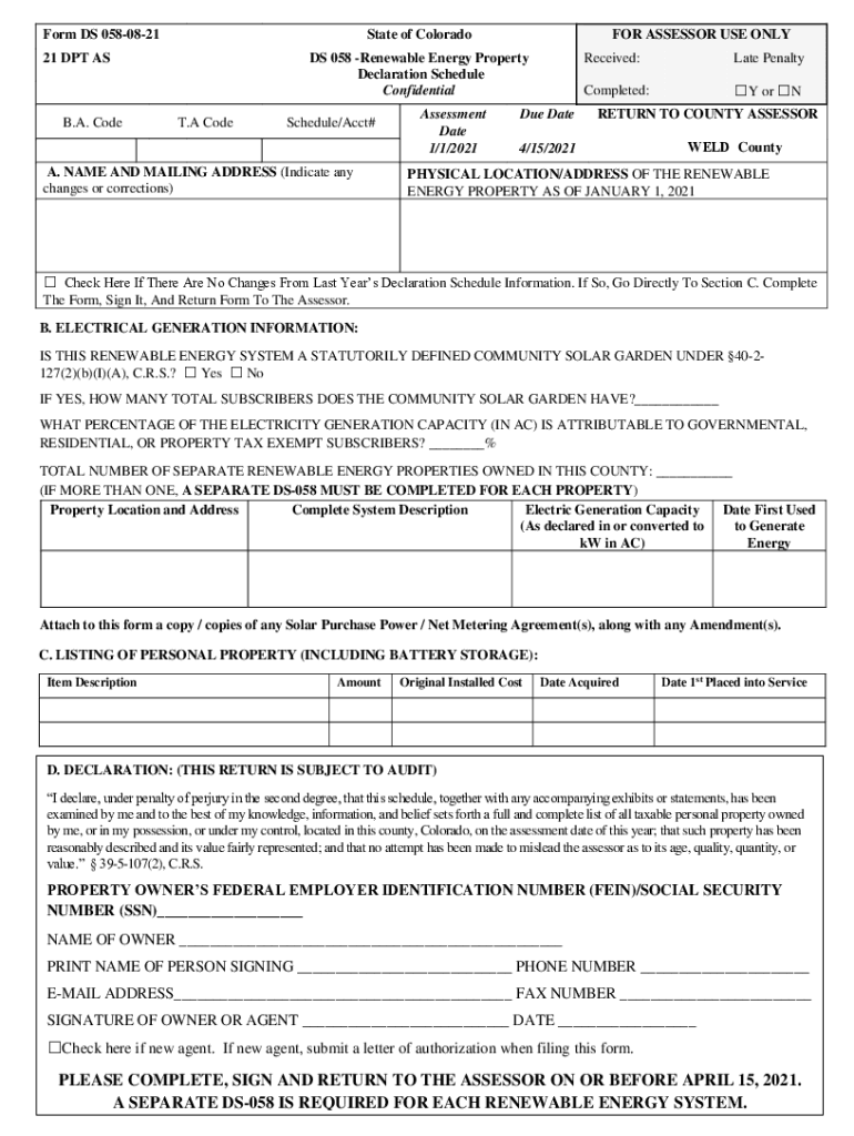 Form DS 058A0821DS 058 Renewable Energy Property Declaration Schedule and InstructionsState of Colorado DATE APRIL 15, 2021, FOR ASSESSMENT YEAR BEGINNING JANUARY 1, 2021General Information (Declaration
