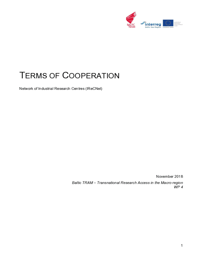 TERMS OF COOPERATION Network of Industrial Research Centers (Irene)November 2018 Baltic TRAM Transnational Research Access in the Macro region WP 41TABLE OF CONTENTS SECTION I ___ 3 1 BACKGROUND AND
