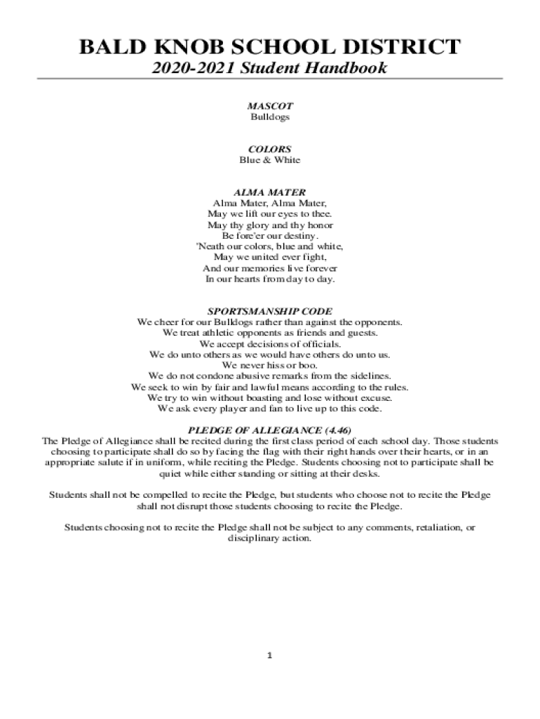 BALD KNOB SCHOOL DISTRICT 20202021 Student Handbook MASCOT BulldogsCOLORS Blue & White ALMA MATER, Alma Mater, May we lift our eyes to thee. May thy glory and thy honor Be fore\'er our destiny. \'Neath