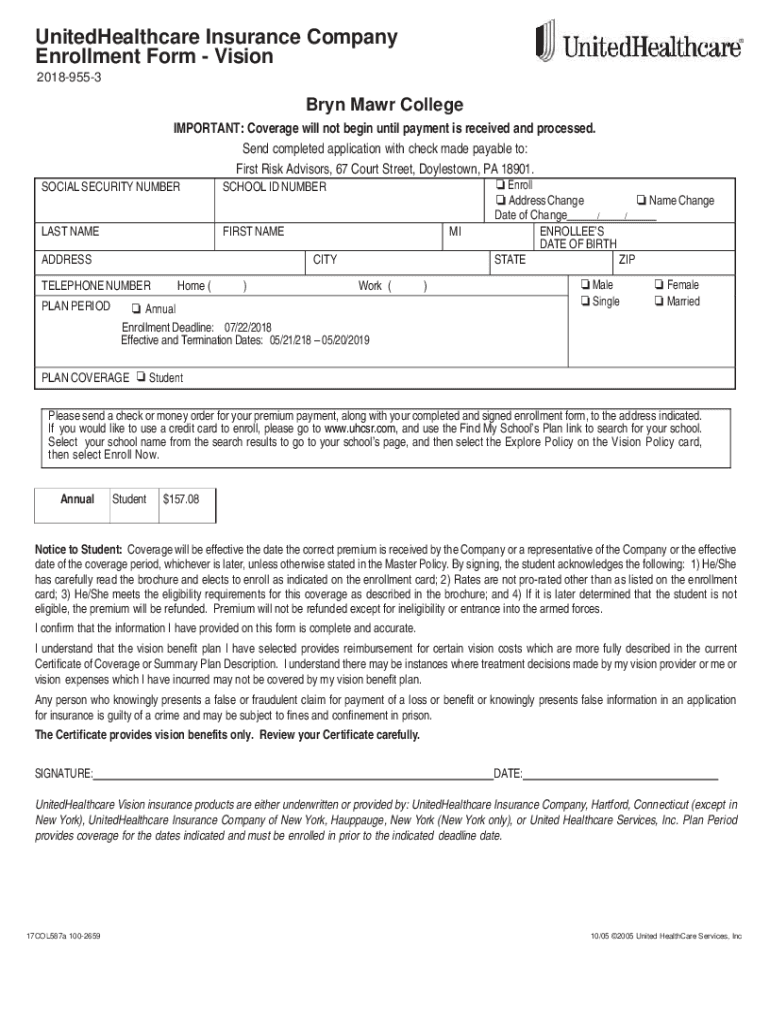 UnitedHealthcare Insurance Company Enrollment Form Vision 20189553Bryn Mar College IMPORTANT: Coverage will not begin until payment is received and processed. Send completed application with check