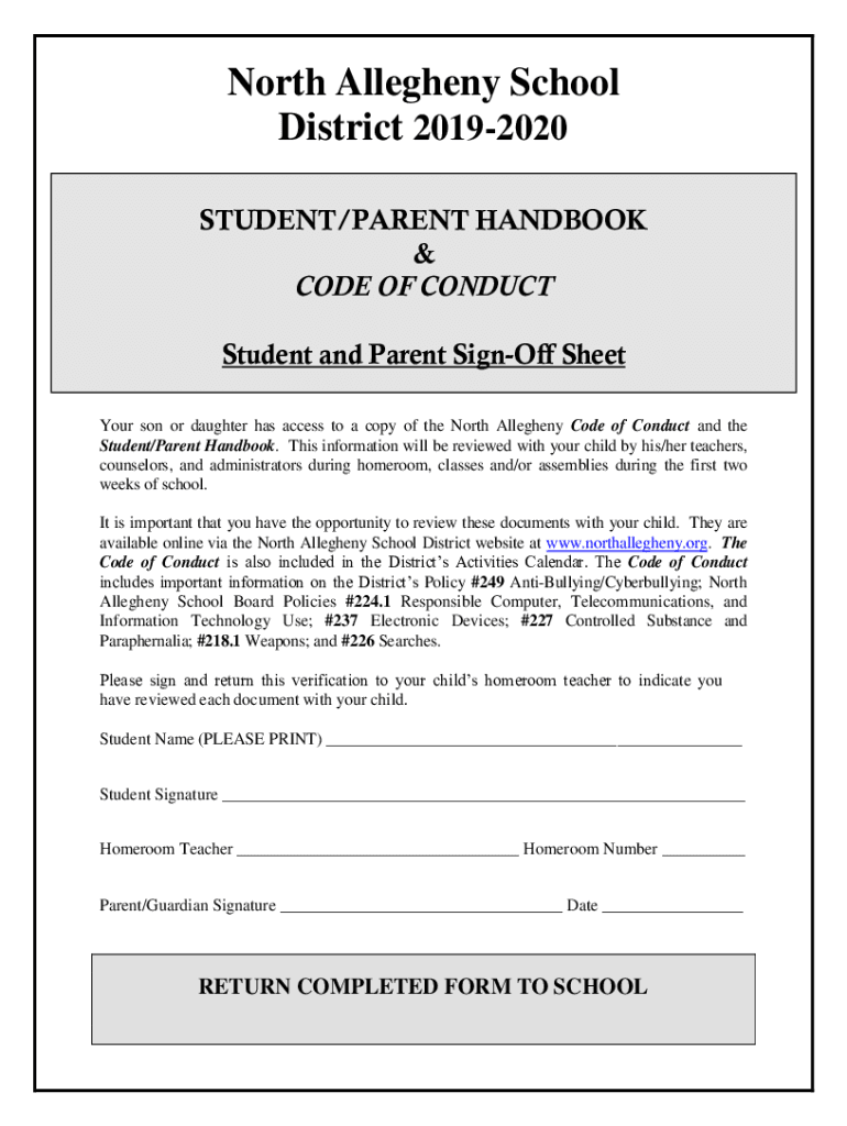 North Allegheny School District 20192020 STUDENT/PARENT HANDBOOK & CODE OF CONDUCT Student and Parent Sign-off Sheet Your son or daughter has access to a copy of the North Allegheny Code of Conduct