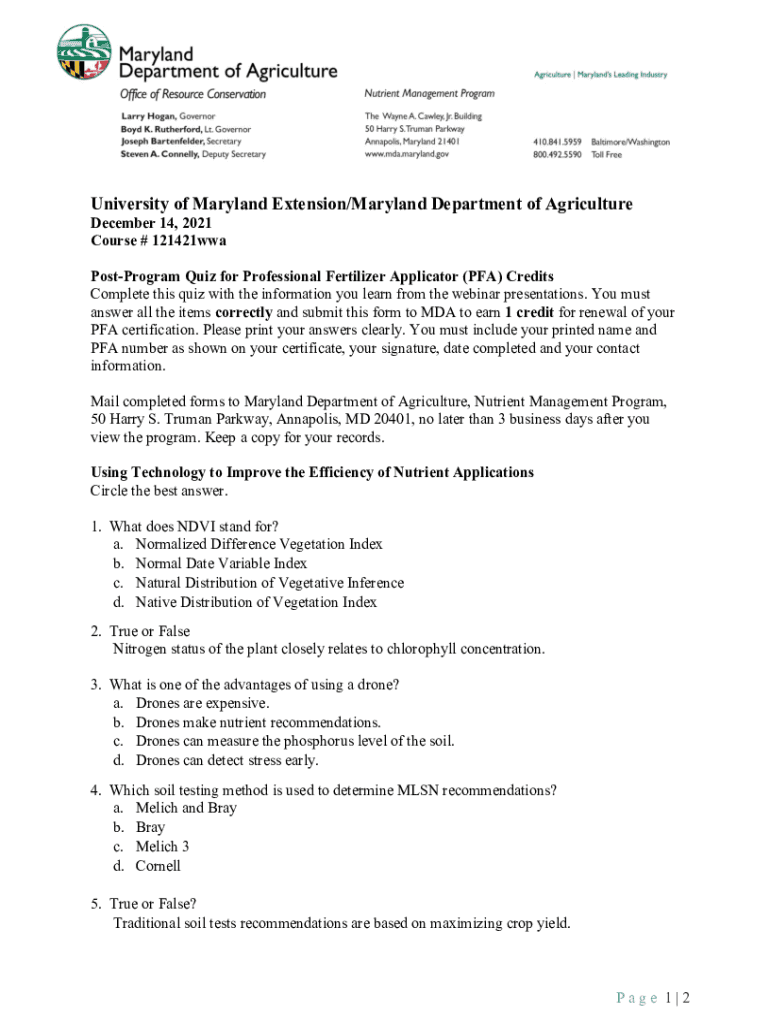 University of Maryland Extension/Maryland Department of Agriculture December 14, 2021, Course # 121421wwa Pre-program Quiz for Professional Fertilizer Applicator (PFA) Credits Complete this quiz with