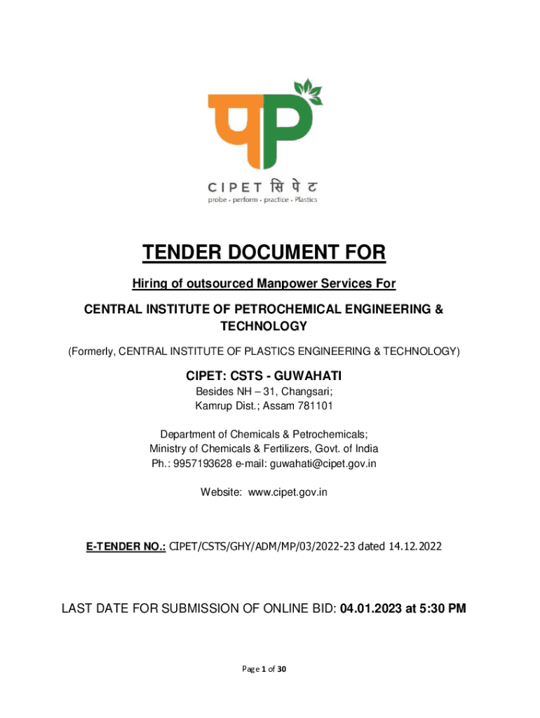 TENDER DOCUMENT FOR Hiring of outsourced Manpower Services For CENTRAL INSTITUTE OF PETROCHEMICAL ENGINEERING & TECHNOLOGY (Formerly, CENTRAL INSTITUTE OF PLASTICS ENGINEERING & TECHNOLOGY)CIVET: