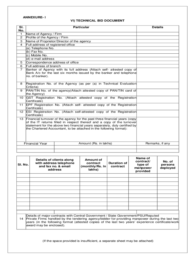 Appendix I VI) TECHNICAL BID DOCUMENT SL. No. 1 2 3 45 6 78 9 10 11 12 13ParticularDetailsName of Agency / Firm Profile of the Agency / Firm Name of Proprietor/Director of the agency Full address