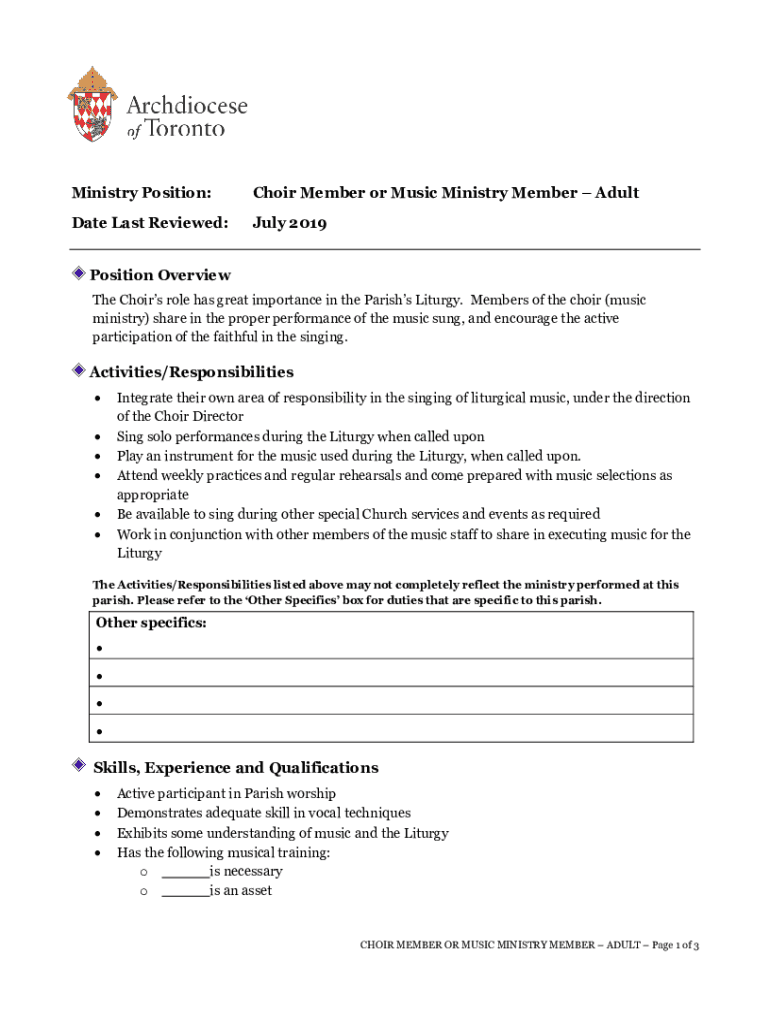 Ministry Position:Choir Member or Music Ministry Member Adulterate Last Reviewed:July 2019Position Overview The Choirs' role has great importance in the Parish's Liturgy. Members of the choir (music