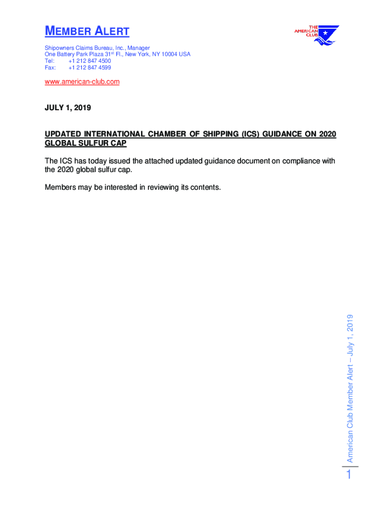 MEMBER ALERT Shipowners Claims Bureau, Inc., Manager One Battery Park Plaza 31st Fl., New York, NY 10004 USA Tel: +1 212 847 4500 Fax: +1 212 847 4599www.americanclub.comply 1, 2019UPDATED INTERNATIONAL