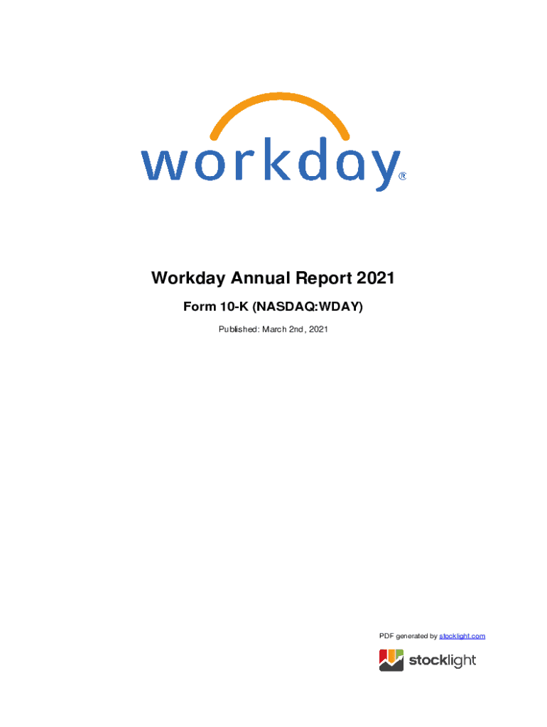 Workday Annual Report 2021 Form 10K (NASDAQ:DAY) Published: March 2nd, 2021PDF generated by stock light. Counted STATES SECURITIES AND EXCHANGE COMMISSION Washington, D.C. 20549FORM 10K (Mark One)ANNUAL
