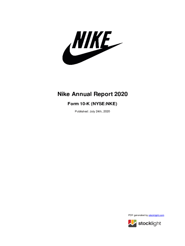 Nike Annual Report 2020 Form 10K (NYSE:NIKE) Published: July 24th, 2020PDF generated by stock light. Counted STATES SECURITIES AND EXCHANGE COMMISSION Washington, D.C. 20549FORM 10K (Mark One) ANNUAL