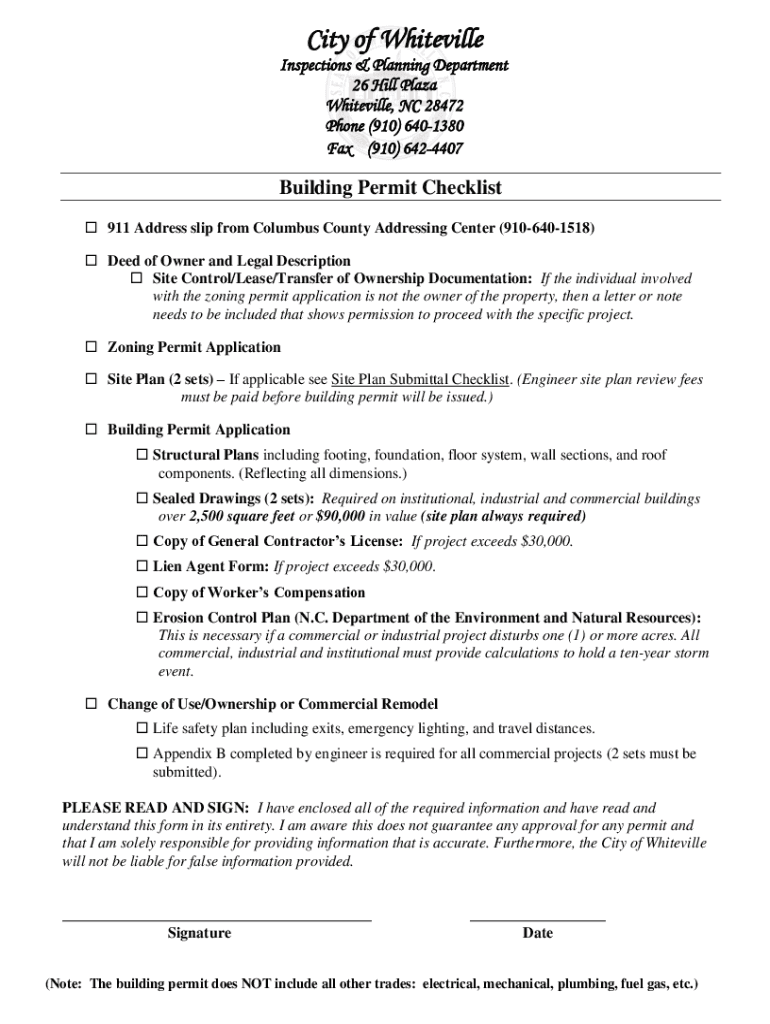 City of Whitehall Inspections & Planning Department 26 Hill Plaza Whitehall, NC 28472 Phone (910) 6401380 Fax (910) 6424407Building Permit Checklist 911 Address slip from Columbus County Addressing