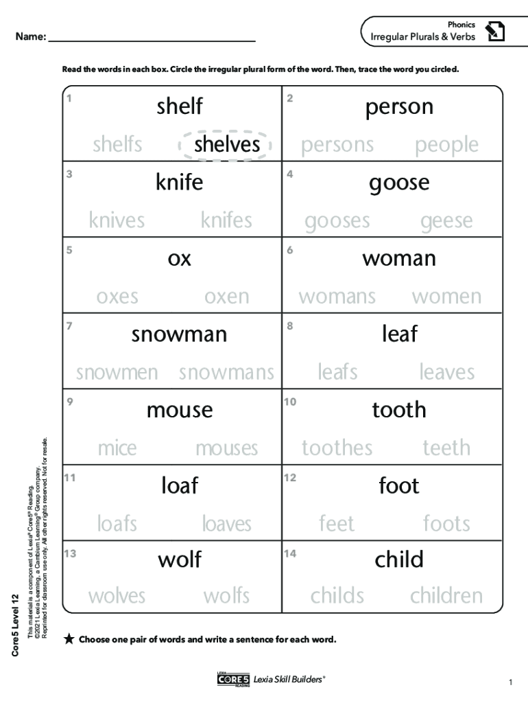 LEVEL 12 | PhonicsName:Irregular Plurals & Verbs Read the words in each box. Circle the irregular plural form of the word. Then, trace the word you circled.shelf1shelfsshelves knife3knivesknifesgoosesoxenmouseThis