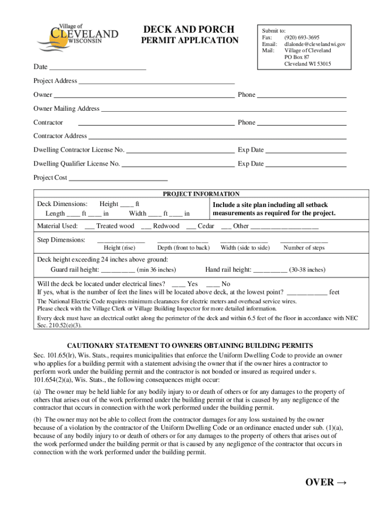 DECK AND PORCH PERMIT APPLICATION Date ___Submit to: Fax: (920) 6933695 Email: dlalonde@clevelandwi.gov Mail: Village of Cleveland PO Box 87 Cleveland WI 53015Project Address OwnerPhoneOwner Mailing