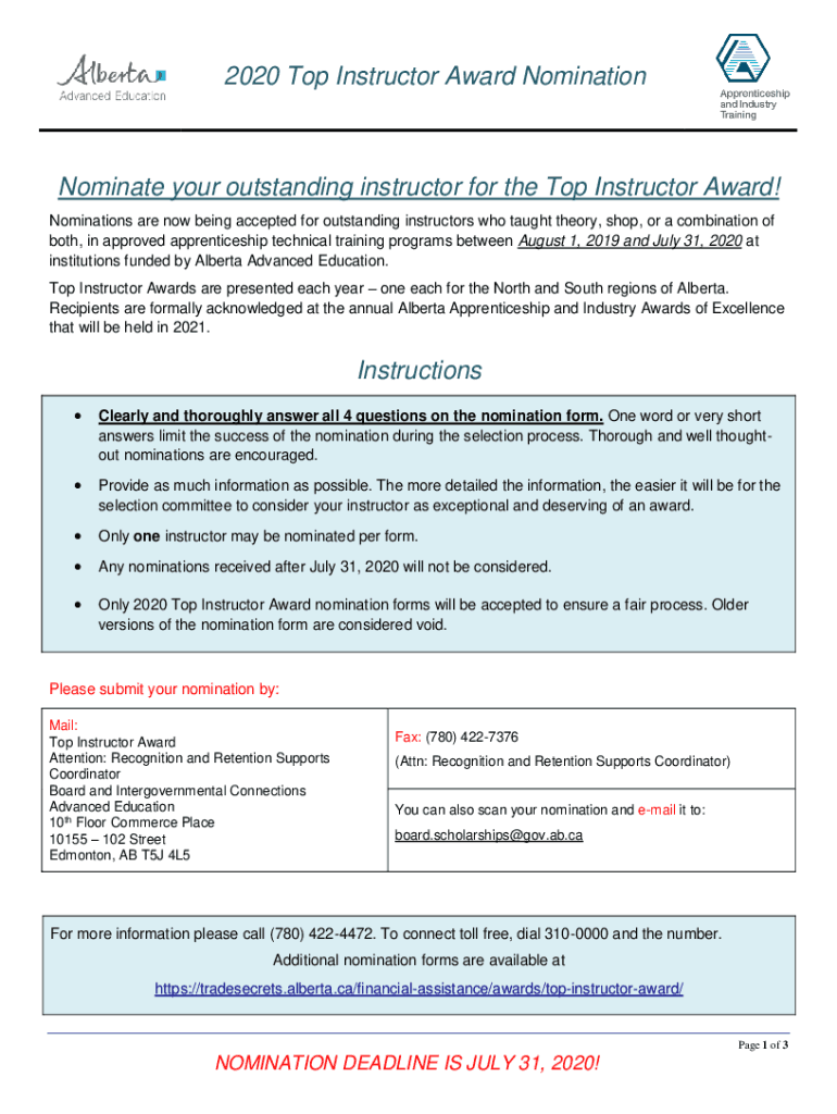 2020 Top Instructor Award NominationNominate your outstanding instructor for the Top Instructor Award! Nominations are now being accepted for outstanding instructors who taught theory, shop, or a