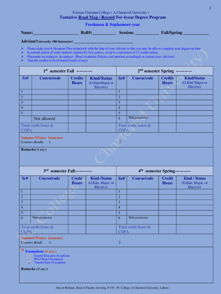 1 Forman Christian College (A Chartered University)Tentative Road Map / Record For 4year Degree Program Freshmen & Sophomore year Name:___ Roll#:___ Session: ___ Fall/Spring ___ Advisor/University
