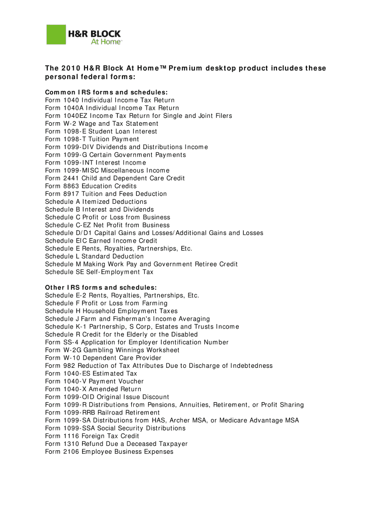The 2010 H&R Block At Home Premium Tax Forms is a set of federal tax documents used by individuals to file their personal income tax returns with the IRS.