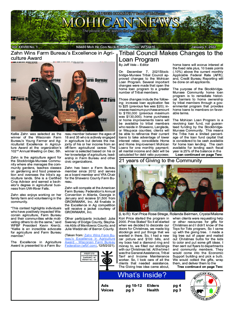 STOCKBRIDGEMUNSEE COMMUNITY Band of MohicansMOHICAN NEWS The people of the waters that are never still. XXVIII No. 1N8480 MOH He Con Neck Road Bowler, WI 54416Zahn Wins Farm Bureaus Excellence in